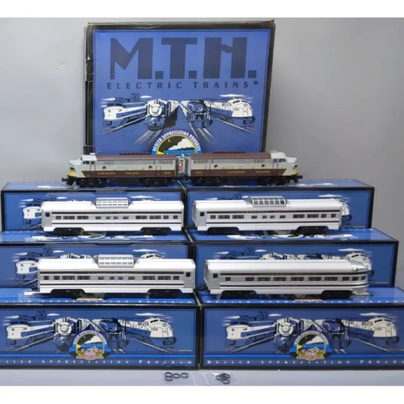 Here is an MTH 20-80001 Canadian Pacific Dealer Appreciation Program Set which includes F3 AA Diesel Locomotives with four extruded aluminum cars. This set is a copy of the famous Lionel postwar set #2296W from 1957. This set also includes a 20-80001b1A Canadian Pacific F-3 A-Unit with Proto-Sound, 20-80001b1B Canadian Pacific F-3 A-Unit Non-Sound Equipped, and (3) Canadian Pacific Vista Dome Passenger Cars model numbers 20-80001b2C, 20-80001b2D and 20-80001b2E, and a 20-80001b2F Canadian Pacific Observation Passenger Car. The locomotives feature 2 precision flywheel equipped motors, die-cast 4-wheel trucks, directional constant voltage head light, two cab figures, and Lead A Unit includes Proto-Sound Digital Sound with squeaking breaks and passenger station sounds by QSI. The passenger cars feature 4-wheel trucks, die-cast truck sides, operating die-cast couplers, interior lighting, and an aluminum extruded body. This locomotive does not include DCS (Digital Command System) features because it has ProtoSound 1.0. Only locomotives with ProtoSound 2.0 and ProtoSound 3.0 include DCS functions.