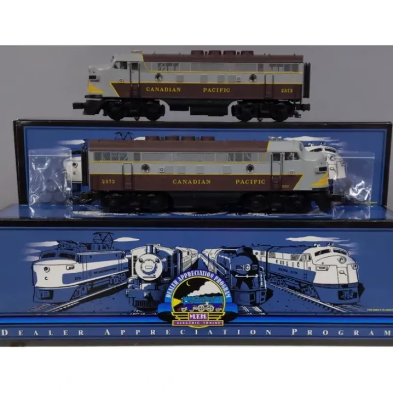 Here is a MTH 20-80001B Dealer Appreciation Program Set. This set includes a 20-80001b1A Canadian Pacific F-3 A-Unit Powered Unit with Proto-Sound, 20-80001b1B Canadian Pacific F-3 A-Unit Dummy Diesel. Each locomotive features die-cast metal sprung trucks, metal wheels and axles, and operating knuckle couplers. The powered locomotive features ProtoSound 1.0.