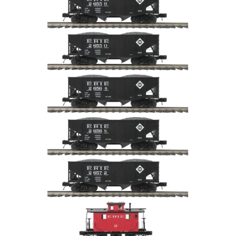 This is MTH 20-90671 Erie 5-Car 2-Bay Fish Belly Hopper. 5-car 2-bay fish belly hopper car set with caboose, Erie. Hopper car numbers: 26559, 26550, 26564, 26568, 26572. Bobber caboose number: 12. MTH Premier O Scale freight car sets are the perfect complement to many of the locomotives featured earlier in this catalog. They also go great with any manufacturer’s scale proportioned O Gauge locomotives. Each car in these sets is individually numbered for authentic realism. When you prefer the convenience of a ready-to-run unit train, M.T.H. Premier Line 6-car sets are a great choice.