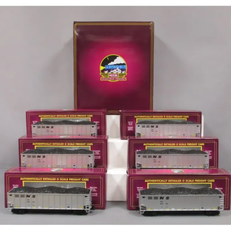 This is MTH 20-90734 O NS 6pk Coalporter Hoppers. 6-car coalporter hopper car set, Norfolk Southern. Car numbers: 46402, 46423, 46435, 46447, 46455, 46464. MTH Premier O Scale freight car sets are the perfect complement to many of the locomotives featured earlier in this catalog. They also go great with any manufacturer’s scale proportioned O Gauge locomotives.