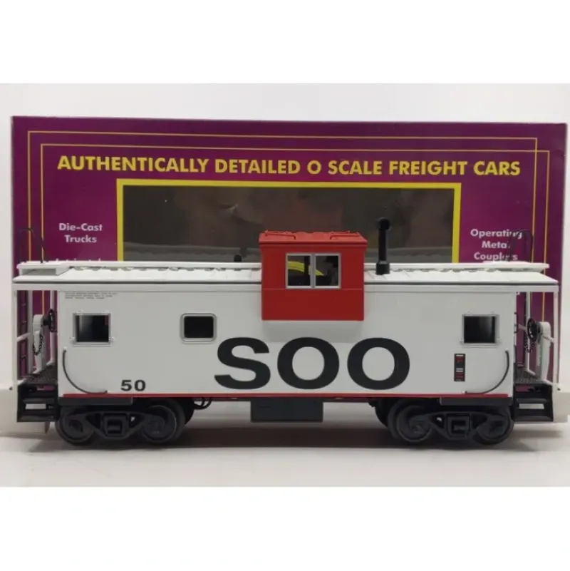 This is a MTH 20-91563 O Soo Line Extended Vision Caboose. This features Intricately Detailed, Durable ABS Body, Stamped Metal Floors, Detailed Car Interior, Metal Wheels and Axles, Die-Cast 4-Wheel Trucks, Fast-Angle Wheel Sets, Needle-Point Axles, (2) Operating Die-Cast Metal Couplers, O Scale Kadee-Compatible Coupler Mounting Pads, Caboose Interiors with Overhead Lighting, Detailed Brake Wheel, Separate Metal Handrails, Brakeman Figure, 1:48 Scale Dimensions, Unit Measures:10 3/4 x 2 3/4 x 4, and Operates On O-31 Curves.
