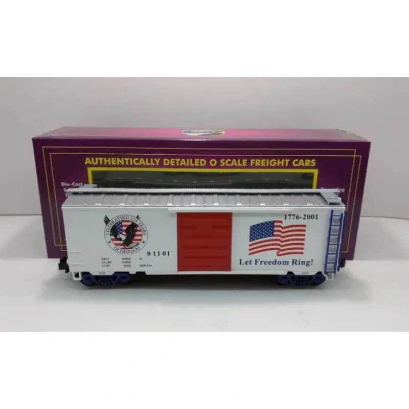 Here we have an MTH 20-93092 O Gauge American Freedom Boxcar #91101. This boxcar features sliding doors, die-cast metal sprung trucks, die-cast metal operating knuckle couplers, metal wheels and axles.