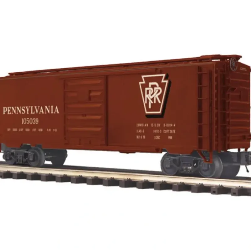 This is MTH 20-93607 O PRR 40′ Boxcar. Box car, Pennsylvania. Car numbers: 105039, 105034. With see-through roof walks, grab irons, and other separately added parts, this model is a detailed replica of the Pullman-Standard PS-1 boxcar. Pullman had been making freight cars for more than half a century when it hit a home run with the PS-1. Introduced in 1947, it set the standard for postwar American freight cars. What made the PS-1 a landmark was its welded construction an area in which Pullman led the industry. In addition to lighter weight, welding offered superior strength and better resistance to weather and corrosion than contemporary riveted cars.