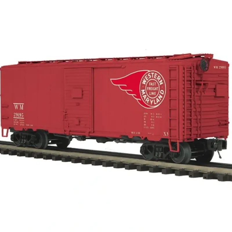 This is MTH 20-93630 O scale AAR 40′ boxcar, 3-rail, ready to run Premier, Western Maryland. Numbers: 29195, 29168. The 40 steel box car so familiar to model railroaders was a product of the 1930s. Wood box cars, which were built into the World War I era, and early steel cars were largely non-standardized, with details varying from railroad to railroad. The move toward standardization began with American Railway Association (ARA) designs of 1923 and 1932. It culminated in the 1937 AAR box car, the prototype for this Premier model, which was adopted by railroads from coast to coast and built in the tens of thousands. (The AAR (American Association of Railroads) was and still is the successor to the ARA.)