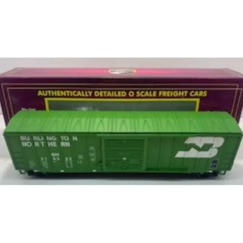 This is MTH 20-93636 O BN 50′ Boxcar. 50′ box car, Burlington Northern. Numbers: 219325, 219322. Our 50 box car is modeled on the fleet of cars originally built for Railbox service in the 1970s and early 1980s. Formed in 1974 as a subsidiary of Trailer Train Company (now TTX Company), Railbox did for box cars what Trailer Train had done earlier for piggybacking: established a pool of cars that could be used by all member railroads, without the burden of routing rules that prioritized empty cars for return to their home railroad. With its slogan of Next Load, Any Road!, Railbox strove to minimize empty backhauls and keep loaded cars flowing wherever needed, throughout the U.S., Mexico and Canada.