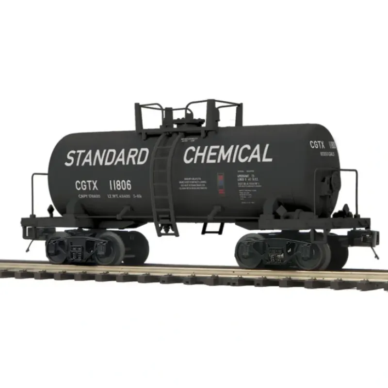 This is a MTH 20-96257 O 8,000-Gallon Tank, Standard Chemical. Intricately Detailed Durable ABS Body, Metal Wheels and Axles, Die-Cast 4-Wheel Trucks, Operating Die-Cast Metal Couplers, O Scale Kadee Compatible Coupler Mounting Pads, Colorful, Attractive Paint Schemes, Fast-Angle Wheel Sets, Needle-Point Axles, 1:48 Scale Dimensions, Separate Metal Handrails, Unit Measures:9 1/16 x 2 3/4 x 3 7/8, Operates On O-27 Curves.