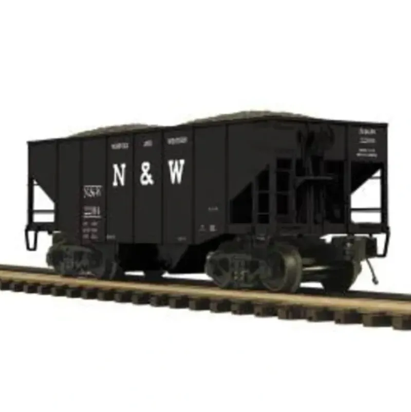 Here is a MTH 20-97308 Norfolk & Western 2-Bay Fish Belly Hopper #22106. This car features die-cast metal sprung trucks, operating knuckle couplers, metal wheels and axles.