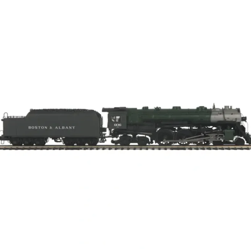 This is an MTH 2235832 O Scale Boston & Albany 4-6-4 J-1e Hudson Steam Engine with Proto-Sound 3.0 (Scale Wheels) Cab # 606. Product Features:Die-Cast Boiler and Chassis, Die-Cast Tender Body, Authentic Paint Scheme, Real Tender Coal Load, Die-Cast Locomotive and Tender Trucks, Engineer and Fireman Figures, Metal Handrails and Whistle, Metal Wheels and Axles, Kadee Coupler Mounting Pads, Prototypical Rule 17 Lighting, Constant Voltage Headlight, Operating Firebox Glow, Operating Marker Lights, Lighted Cab Interior, Operating Tender Back-up Light, 7-Pole Precision Flywheel-Equipped Motor, Synchronized Puffing ProtoSmoke System, Locomotive Speed Control In Scale MPH Increments, Wireless Drawbar, 1:48 Scale Proportions, Onboard DCC Receiver, Proto-Scale 3-2 3-Rail/2-Rail Conversion Capable, Proto-Sound 3.0 With The Digital Command System Featuring: Quillable Whistle With Passenger Station Proto-Effects, Unit Measures:27 x 2 1/2 x 3 7/8, Operates On 42 Radius Curves Steam DCC Features, Headlight/Tail light, Bell, Whistle, Start-up/Shut-down, Passenger Station/Freight Yard Sounds, All Other Lights (On/Off), Master Volume, Front Coupler, Rear Coupler, Forward Signal, Reverse Signal, Grade Crossing, Smoke On/Off, Smoke Volume, Idle Sequence 3, Idle Sequence 2, Idle Sequence 1, Extended Start-up, Extended Shut-down, One Shot Doppler, Coupler Slack, Coupler Close, Single Horn Blast, Engine Sounds, Brake Sounds, Cab Chatter, Feature Reset, Labor Chuff, Drift Chuff.