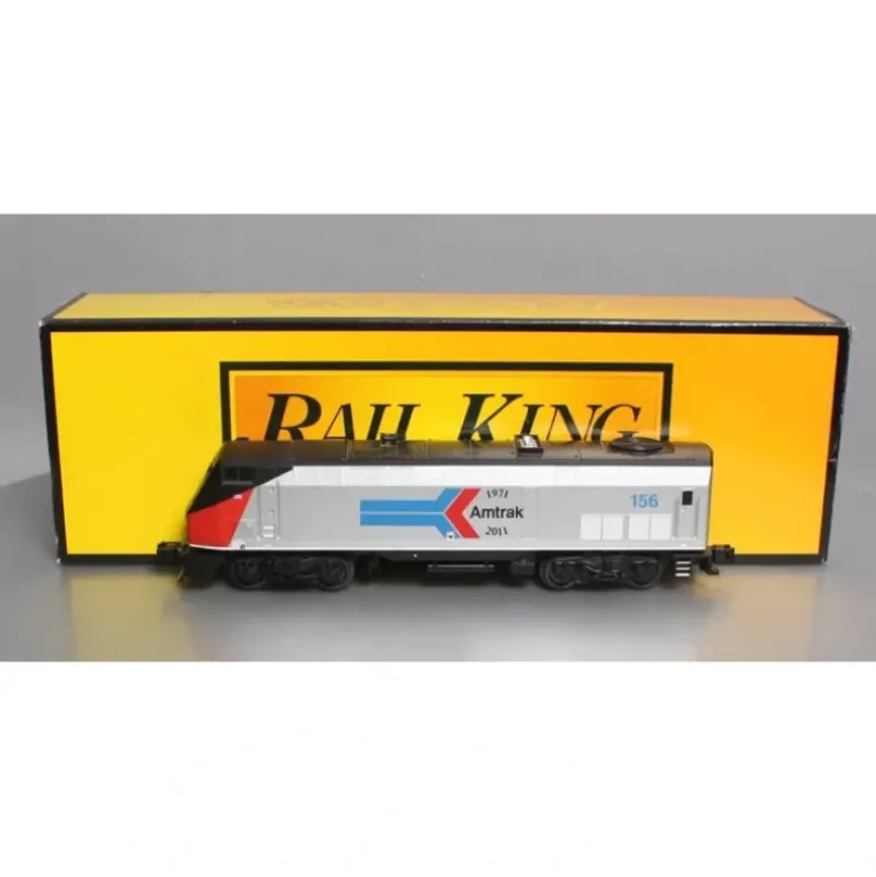 This is a MTH Electric Trains 507-30202171 O Scale GE P40/42 Genesis w/Proto-Sound 3.0 – 3-Rail – RailKing(R) Amtrak #156 (Heritage 40th Anniversary Phase I, silver, red, blue, Arrow Log By the late 1980s, Amtrak was searching for a replacement for its outdated and aging fleet of F40PHs and GP40s. Wary of getting more locomotives that were really designed for freight operation, Amtrak searched for a new, lightweight, high-tech alternative. General Electric provided Amtrak with an answer with its unveiling of the Genesis. Featuring a monocoque frame, advanced electronics, and special environmental and safety features, the Genesis represented the state-of-the-art in U.S. passenger service. Model features an intricately detailed ABS body, metal chassis, metal wheels and axles, two precision flywheel-equipped motors, onboard DCC receiver, Proto-Sound 3.0 featuring passenger station Proto-Effects, lighted cab interior, directional constant voltage LED headlight and speed control in scale MPH increments.
