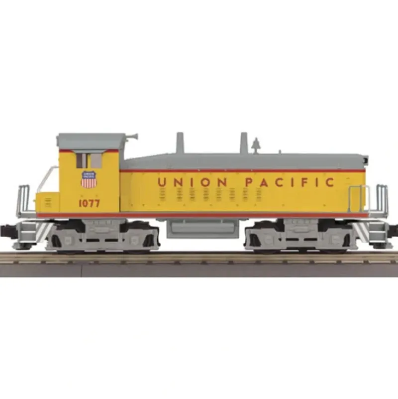 This is MTH 30-20228-1 O-27 NW2 Switcher Diesel Engine with Proto-Sound 3.0, Union Pacific. Cab number: 1077. The NW2 was the big brother of the SW1 switcher. With a longer hood the NW2 housed a 12-cylinder diesel, twice as large as the prime mover in the SW1. The N in NW2 stood for nine hundred horsepower, the power output of the first Electro-Motive Corporation N-series switchers with Winton motors. Power increased to 1000 hp with the 1939 debut of the NW2, the first N-series locomotive with EMC’s new 567 diesel motor – the prime mover that would power nearly all of the most successful first-generation diesels. Within a few years, EMC and Winton Engine, which had been owned by GM since 1930, would become the Electro-Motive Division of General Motors. EMD cataloged the NW2 for a decade, except for a hiatus in production from 1942-1945, ordered by the War Production Board. While rival manufacturers were asked to produce switchers, EMD was the only firm allowed to produce road diesels – a situation that, in retrospect, gave GM a commanding lead in the diesel revolution after the war. By the end of NW2 production in 1949, over 1100 engines had been sold in the United States and Canada, and the hardy N-series switchers were ubiquitous from coast to coast. A popular, near-scale Lionel model ensured the engine was familiar to almost any boy who grew up in the 1950s. An interesting variation was the calf. This cabless version was designed to be run in tandem with a normal NW2 for heavy-duty switching and transfer service between railroad yards. A number of railroads rostered TR2 cow-and-calf combinations, and the Chesapeake & Ohio owned two TR3 herds – a cow and two calves. The NW2 returns to the RailKing lineup in 2014 with everything you need in a hard-working switcher: twin-motored pulling power down to 3 scale miles per hour, dual Proto-Couplers to drop off cars anywhere, and authentic EMD 567 sounds. Did You Know? The W in the NW and SW-series switchers stood for welded, to distinguish engines with welded frames from earlier models with cast steel frames made by General Steel Castings of Granite City, Illinois, a long-time supplier to the railroad industry. Its key features are: Intricately detailed ABS body Die-cast truck sides, pilots and fuel tank Metal chassis Metal handrails and horn Authentic paint scheme Metal wheels, axles and gears Two remote controlled Proto-Couplers Prototypical Rule 17 lighting Directionally controlled constant voltage LED headlights Two precision flywheel-equipped motors Onboard DCC receiver Locomotive speed control in scale MPH increments 1:48 scale proportions Proto-Sound 3.0 with The Digital Command System featuring: Freight yard Proto-Effects Unit measures:12 3/8 x 2 1/2 x 3 7/8 Operates on O-27 curves Diesel DCC features: Headlight/Taillight Bell Horn Start-up/Shut-down Passenger station/Freight yard announcements Lights (except head/tail) Master volume Front coupler Rear coupler Forward signal Reverse signal Grade crossing Idle sequence 3 Idle sequence 2 Idle sequence 1 Extended start-up Extended shut-down Rev up Rev down One shot Doppler Coupler slack Coupler close Single horn blast Engine sounds Brake sounds Cab chatter Feature reset Idle sequence 4 Clickety clack (on/off)