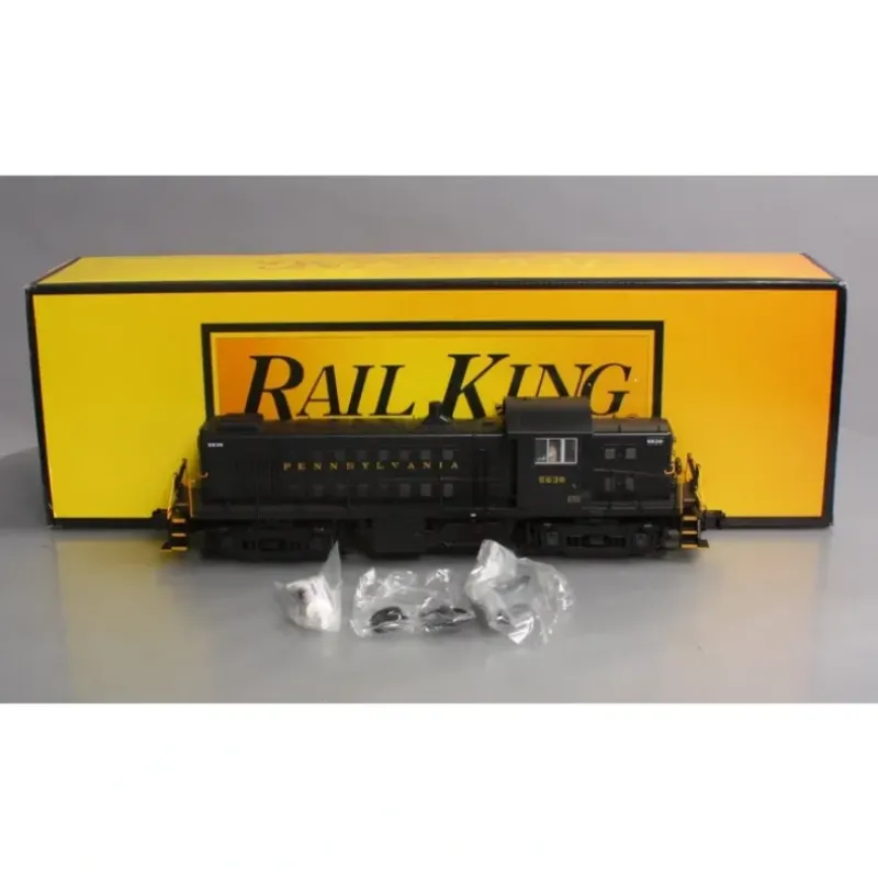 This is a MTH 30202491 O Pennsylvania Railroad Scale Alco RS1 – 3-Rail w/Proto-Sound 3.0 – RailKing #5638. Features: Intricately Detailed ABS Body, Die-Cast Truck Sides, Pilots and Fuel Tank, Metal Chassis, Metal Handrails, (2) Engineer Cab Figures, Metal Wheels, Axles and Gears, (2) Remote Controlled Proto-Couplers, Prototypical Rule 17 Lighting, Directionally Controlled Constant voltage LED Headlights, (2) Precision Flywheel Equipped Motors, Onboard DCC Receiver, Locomotive Speed Control In Scale MPH Increments, 1:48 Scale Proportions, Operating Smoke Unit, Proto-Sound 3.0 With The Digital Command System Featuring: Freight Yard Proto-Effects, Unit Measures:14 x 2 1/2 x 4, Operates On O-31 Curves Diesel DCC Features, Headlight/Taillight, Bell, Horn, Start-up/Shut-down, Passenger Station/Freight Yard Announcements, Lights (except head/tail), Master Volume, Front Coupler, Rear Coupler, Forward Signal, Reverse Signal, Grade Crossing, Idle Sequence 3, Idle Sequence 2, Idle Sequence 1, Extended Start-up, Extended Shut-down, Rev Up, Rev Down, One Shot Doppler, Coupler Slack, Coupler Close, Single Horn Blast, Engine Sounds, Brake Sounds, Cab Chatter, Feature Reset, Idle Sequence 4, Clickety Clack (On/Off).