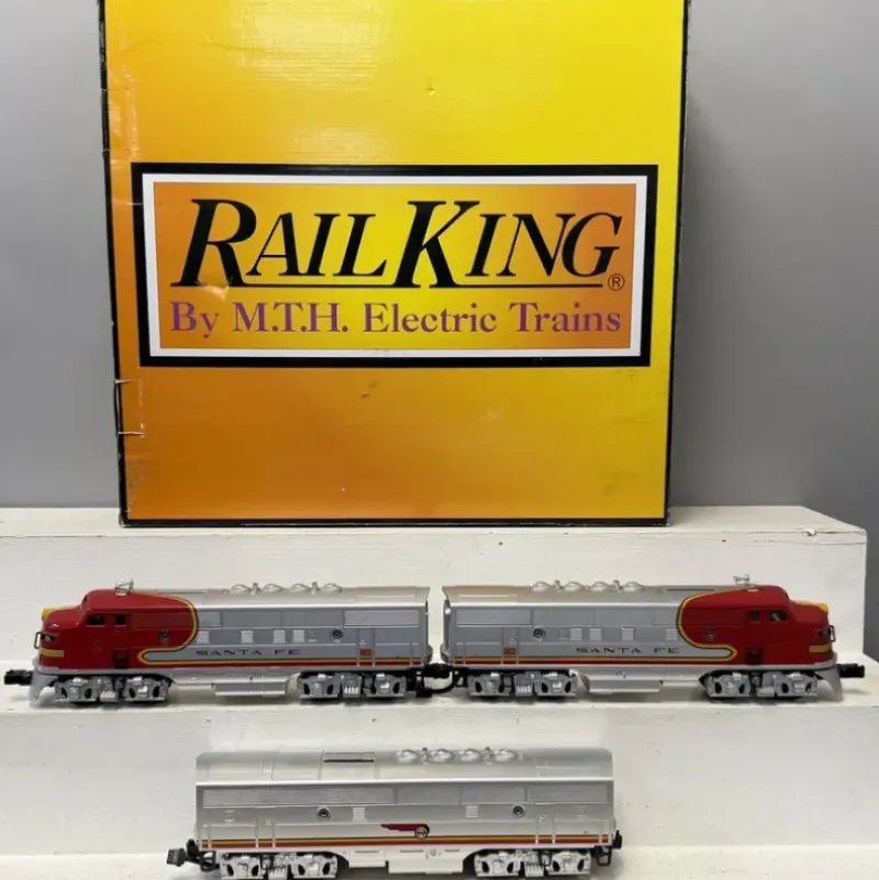 This is a MTH 30202791 O Santa Fe F-3 ABA Diesel Engine Set with Proto-Sound 3.0 #26, #30A, #33. This features Intricately Detailed ABS Bodies, Die-Cast Truck Sides, Pilots and Fuel Tank, Die-Cast Metal Chassis, Metal Handrails and Horn, Authentic Paint Scheme, Metal Wheels, Axles and Gears, (2) Remote Controlled Proto-Couplers, Prototypical Rule 17 Lighting, Directionally Controlled Constant Voltage LED Headlights, (2) Precision Flywheel-Equipped Motors In Lead A-Unit, Operating Smoke Unit, Onboard DCC Receiver, Locomotive Speed Control In Scale MPH Increments, 1:48 Scale Proportions, Proto-Sound 3.0 With The Digital Command System Featuring: Passenger Station Proto-Effects, Unit Measures:40 1/4 x 2 5/8 x 3 3/4, and Operates On O-31 Curves.