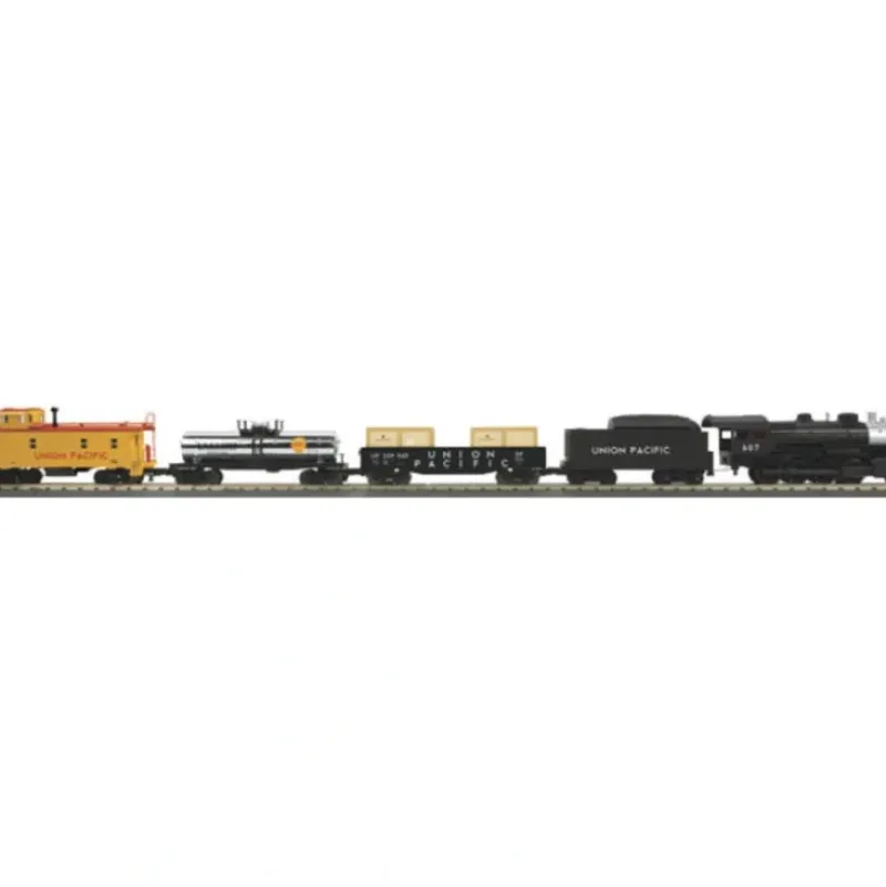 Recreate the excitement of steam era railroading in the American West with this Union Pacific freight set that includes a rugged 2-8-0 steam locomotive with puffing smoke synchronized to the drive wheel revolutions; Proto-Speed Control for smooth and steady speeds from a crawl to full throttle; traction tires for tremendous pulling power; headlight to light up the night; and a full range of sounds from wailing whistle and clanging bell to squealing brakes and crew conversations.