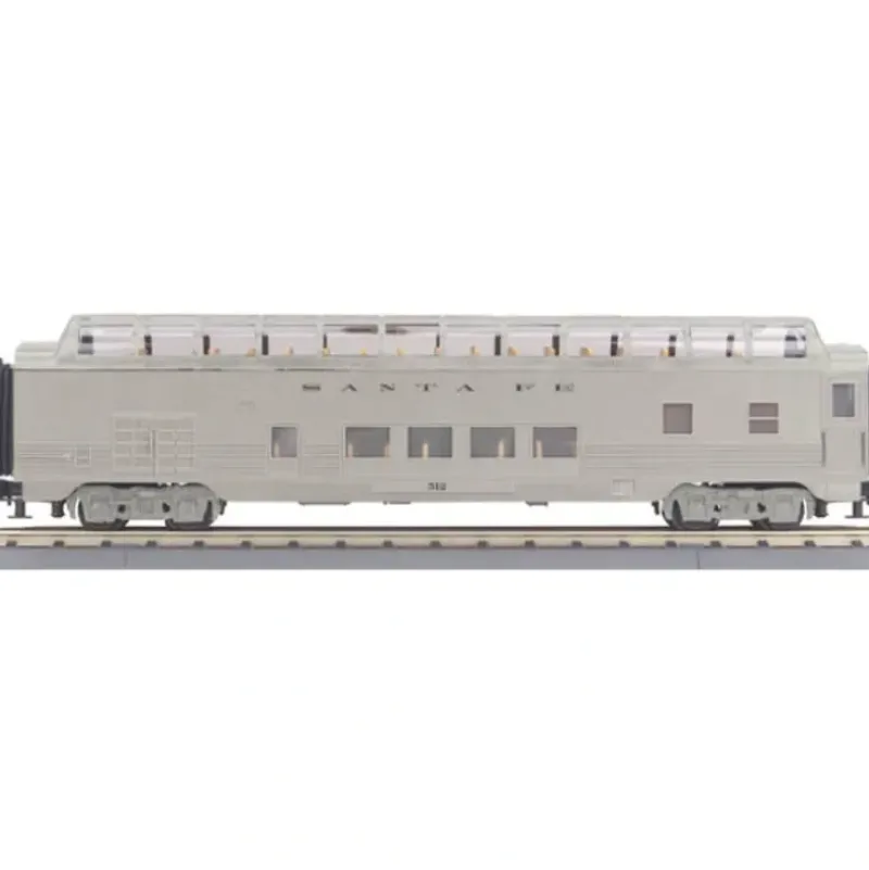 This is MTH 30-67653 O-27 60′ Streamline Full Vista Dome, SF. 60′ streamlined ABS full-length vista dome car – Santa Fe. Vista dome – 512. RailKing Passenger Cars are available in the popular 60′ Streamlined and Madison style bodies. Configured in 4-car, 2-car and single-car configurations, each type features car interior detail, overhead interior lighting, end-of-car diaphragms and intricate under-car detail. All configurations are mounted atop die-cast metal 4 or 6-wheel trucks with operating metal couplers, metal wheels and metal axles.