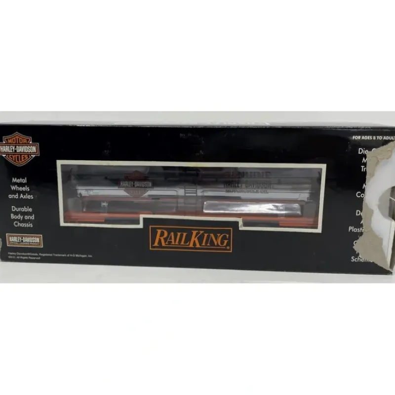 This is an MTH 30-73220 Harley Davidson Tank Car (Chrome). This car features die-cast metal sprung trucks, die-cast metal operating knuckle couplers, metal wheels and axles.