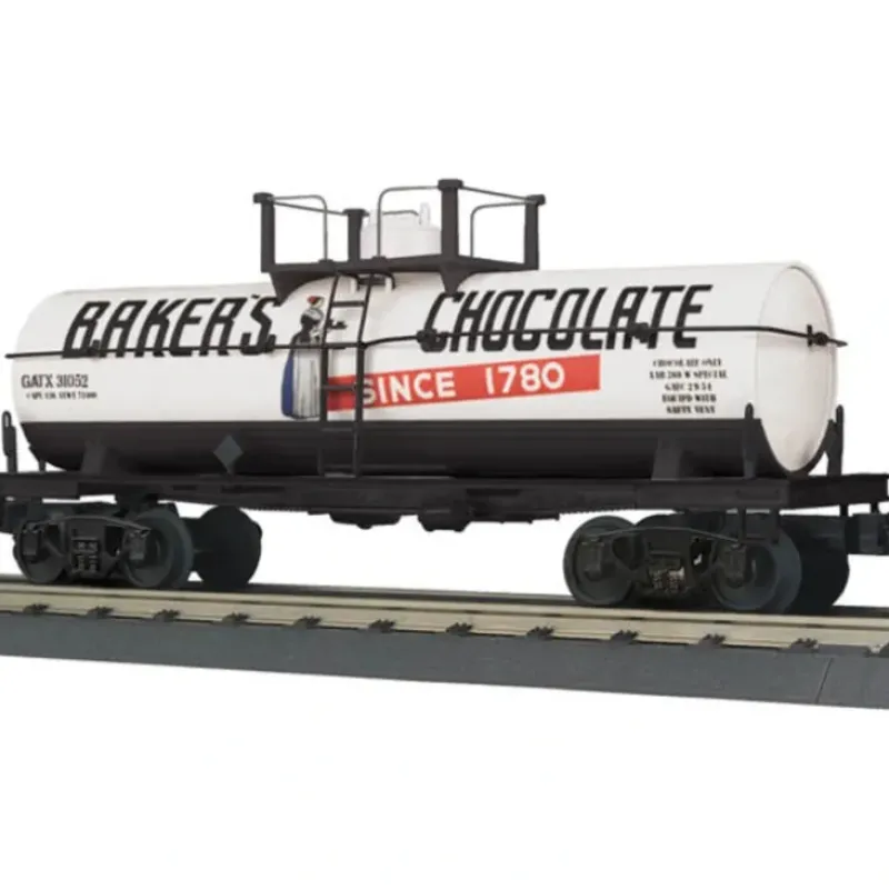 This is MTH 30-73379 O Bakers Chocolate Tank Car. Car number: 31052. High quality, traditionally sized RailKing Freight Cars provide detailed bodies and colorful paint schemes for the O Gauge railroader. MTH makes an enormous variety of RailKing Freight Cars, including many different car types and roadnames. No matter what era or part of the country you are modeling, RailKing is sure to have something for you.