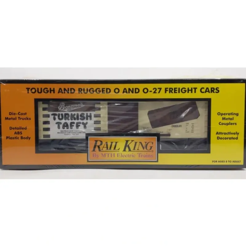 Here is a MTH 30-74128 Bonomo Taffy-Chocolate Box Car. Features for this boxcar include durable plastic construction, intricate detailing, sliding doors, die-cast metal sprung trucks, die-cast metal operating knuckle couplers, metal wheels and axles.