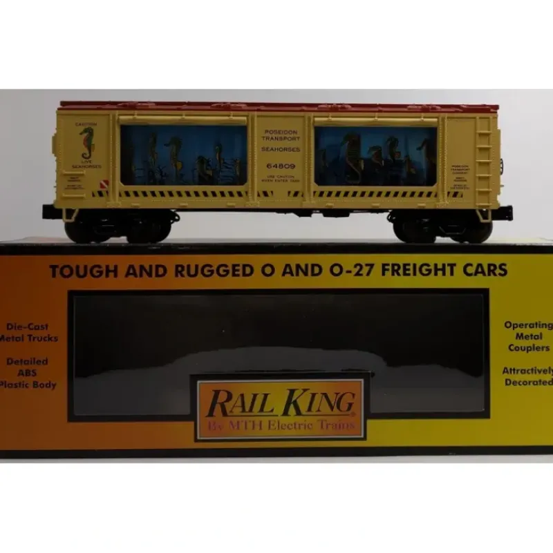 This is a MTH 30-79353 O Gauge Seahorse Transport Operating Action Car. This exciting car features a backlighted moving animation strip visible through each of the car’s four large viewing windows. Utilizing a quiet and efficient motorized player and bright LED lighting, the animated action really shines bright! Its key features include an intricately detailed durable ABS body, Metal wheels and axles, Die-cast 4-wheel trucks, Operating die-cast metal couplers, Colorful, attractive paint schemes, Decorative brake wheels, Separate metal handrails, Fast-angle wheel sets, Needle-point axles, Moving backlit underwater scenes, Unit measures: 11 1/2 x 2 3/8 x 2 5/16, and it Operates on O-27 curves.