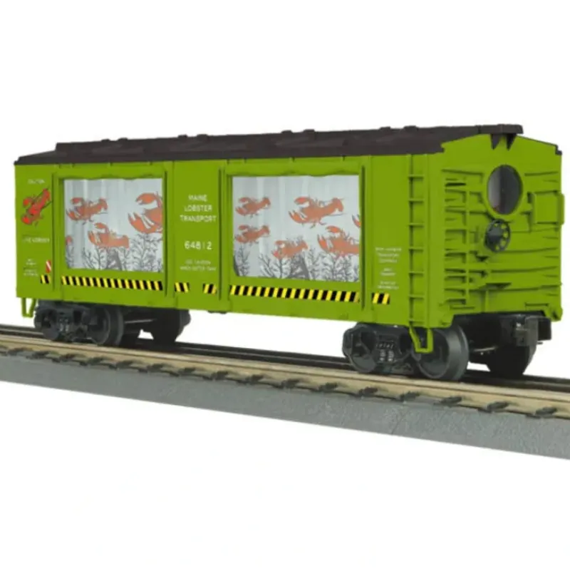 This is MTH 30-79354 O Maine Lobster Transport Operating Action Car. Car number: 64812. This exciting car features a backlighted moving animation strip visible through each of the cars four large viewing windows. Utilizing a quiet and efficient motorized player and bright LED lighting, the animated action really shines bright!