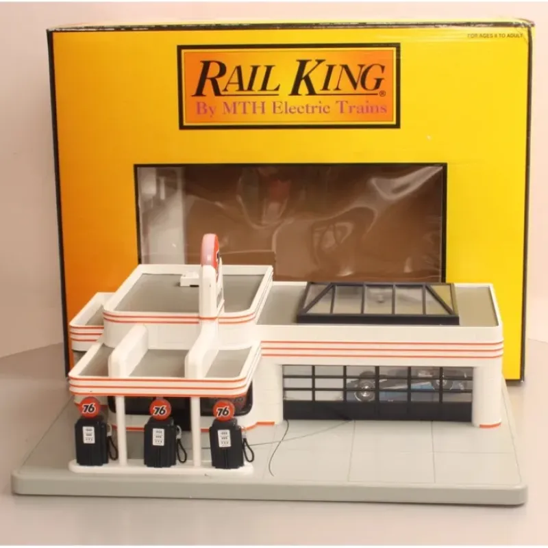 Here is a MTH 30-9109 Union 76 Operating Gas Station from 1999. It features an operating door with digital gas station sounds. It measures 11 by 16 inches. The original ’67 Chevy convertible is not included.