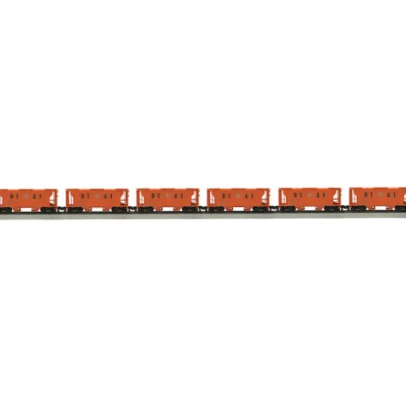 This is MTH 35-70006 6-Car Hopper Set DT&I. 6-car Ps-2 hopper car set, Detroit Toledo & Ironton. Car numbers: 11126, 11149, 11105, 11133, 11152, 11168. Until the advent of the covered hopper, bulk commodities like grain and cement were usually packed in s