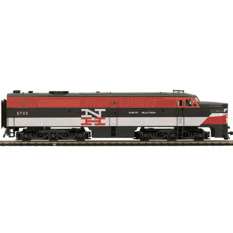 This is MTH 80-2084-0 HO PA w/NMRA Socket, NH #785. Alco PA A unit (DCC ready), New Haven. Cab number: 0785. The PA was Alco’s glamour girl. While Electro-Motive’s E-units easily outsold Alco’s passenger engine, the PA is widely regarded as the most beautiful first-generation diesel – period. Perhaps no other locomotive looked so right at the head of the streamlined trains of the late forties and fifties that were the last hurrah of American long-distance passenger service. The 294 PA’s and cabless PB’s built between 1946 and 1953 powered some of America’s most famous name trains, from the Southern Pacific’s Daylight to the Pennsylvania’s Broadway Limited. In recognition of its beauty, some fans refer to the PA as an honorary steam locomotive.