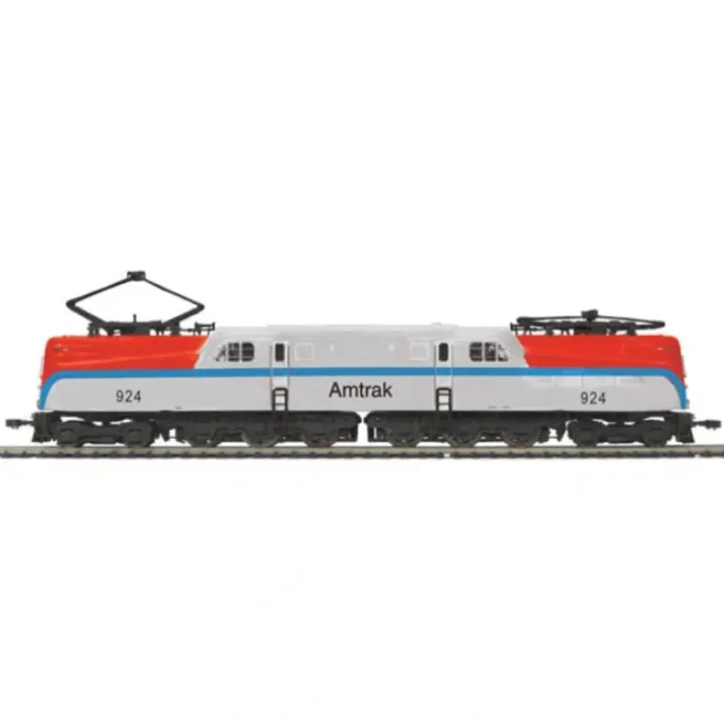 This is MTH80-2152-5 GG-1 Elect PS3E+ AMTK#924. GG-1 electric with Proto-Sound 3E+ (3-rail), Amtrak. Cab number: 924. For more than two decades, the Pennsylvania Railroad experimented with locomotive designs in search of a high-speed, mainline passenger electric. That search ended in 1934 with the GG1, a cooperative effort by the PRR, Baldwin, Westinghouse, and General Electric, based largely on neighbor New Haven’s successful EP3 juice jack. Industrial designer Raymond Loewy cleaned up the original riveted body to create a design that looked contemporary for half a century.