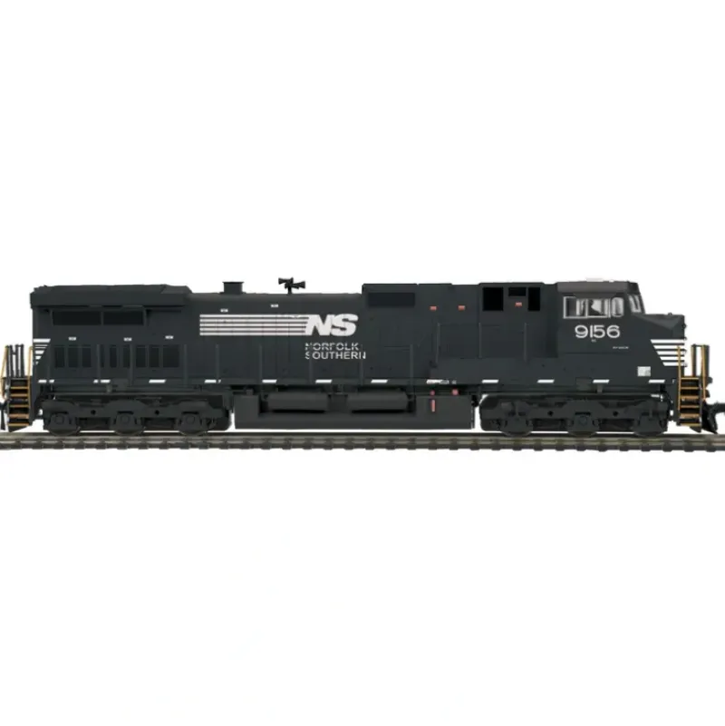 This is an MTH 8023000 HO Scale Norfolk Southern Dash-9 Diesel Engine (DCC Ready) (Black NS logo) Cab No. 9156. Product Features:Intricately Detailed ABS Body, Authentic Paint Scheme & Cab Numbers, Detailed Truck Sides, Pilots and Fuel Tank, Die-Cast Metal Chassis, Detachable Scale Snow Plow, (2) Cab Figures, Constant Voltage Bright LED Headlights, RP-25 Metal Wheels Mounted On Metal Axles, Powerful 12 Volt, Skew Wound 5-Pole Precision Flywheel Equipped Motor, Illuminated Number Boards, Operating Ditch Lights, (2) Scale Kadee Couplers, Built-In NMRA 8-pin plug for DCC, Operates On Code 70, 83, & 100 Rail Curves, Unit Measures:10 9/16 x 1 7/16 x 2 3/16, Operates On 18 Radius Curves.