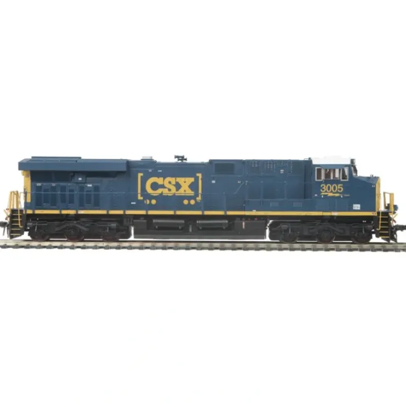 This is a MTH 80-2312-0 HO ES44AC w/NMRA, CSX #3005. roduct Features:, Intricately Detailed ABS Body, Authentic Paint Scheme & Cab Numbers, Detailed Truck Sides, Pilots and Fuel Tank, Die-Cast Metal Chassis, Detachable Scale Snow Plow, (2) Cab Figures, Directionally Controlled Headlights, RP-25 Metal Wheels Mounted On Metal Axles, Powerful 5-Pole Precision Flywheel Equipped Motor, Lighted Cab Interior, Illuminated Number Boards, Operating Ditch Lights, (2) Scale Kadee Couplers, Operates On Code 70, 83, & 100 Rail Curves, Unit Measures:10 9/16 x 1 7/16 x 2 3/16, Operates On 18 Radius Curves.