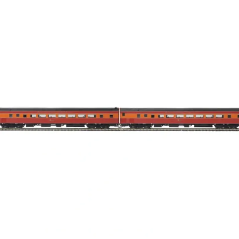 This is MTH 80-60043 HO Chair/Chair/Deskirt, SP. Chair/Chair de-skirted passenger car set, Southern Pacific. Car numbers: 2485, 2486. In 1941 the Daylights were re-equipped with new Pullman-Standard train sets that included articulated cars with full-widt
