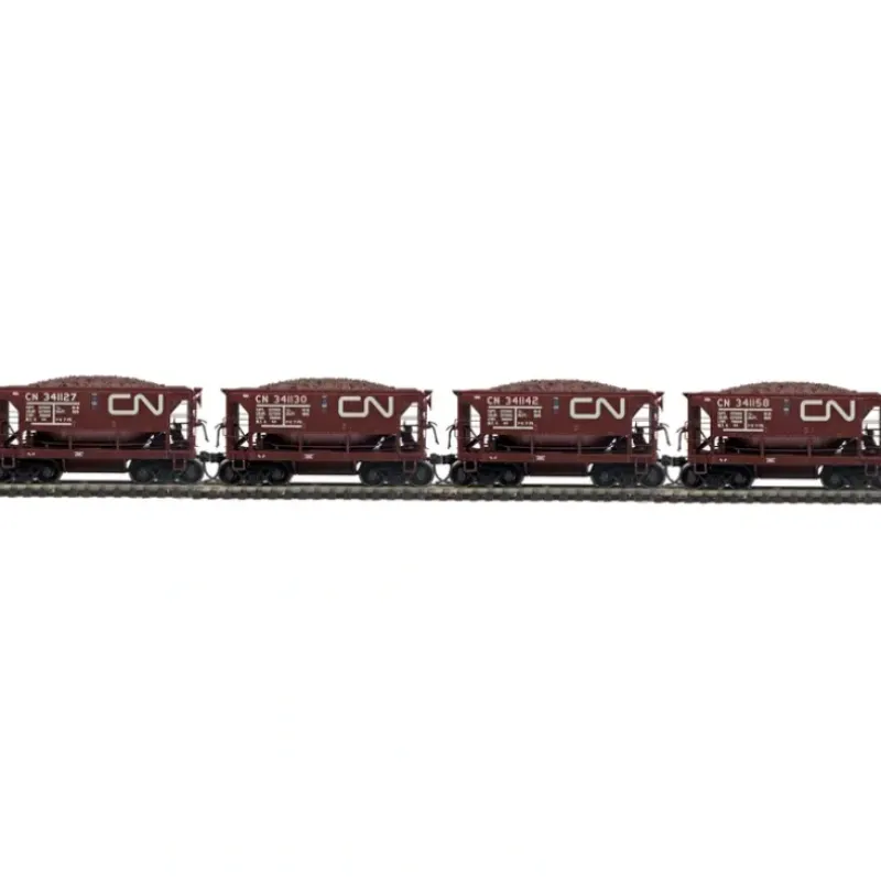 This is a MTH 8090084 HO Canadian National 70-Ton Center Discharge Ore Car with Load 4-Car Set #1. This set includes (4) Individually Numbered Cars. This features Intricately Detailed Durable ABS Body, Metal Wheels and Axles, Decorative Brake Wheels, Separate Metal Handrails, 1:87 Scale Dimensions, Kadee Couplers, Detailed Undercarriage, Detailed 4-Wheel Trucks, and Each Car Operates On 18 Radius Curves.