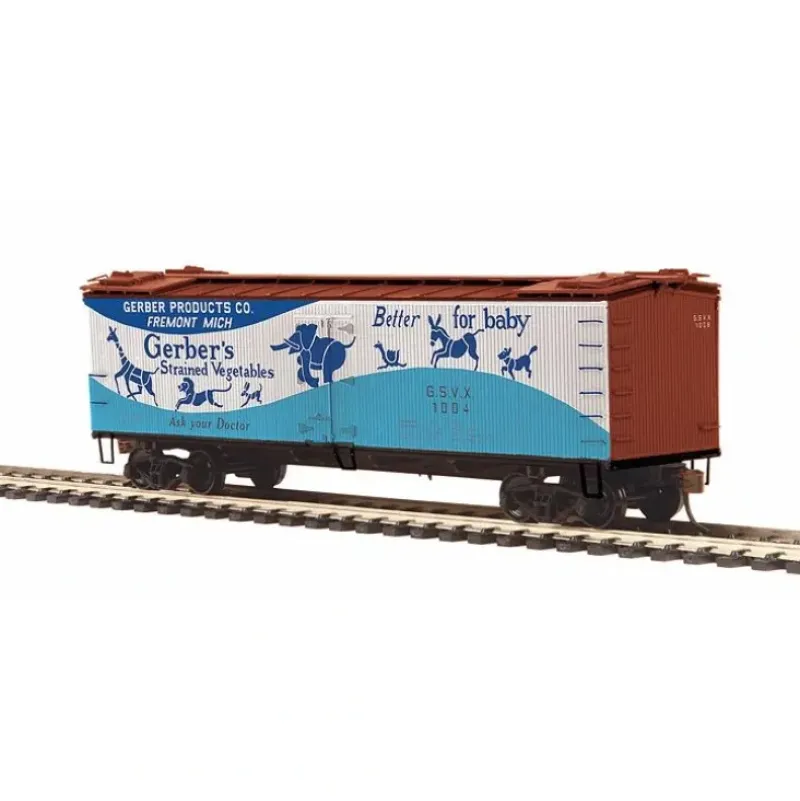 This is MTH 80-94013 HO GERBER R40-2 #1004. R40-2 woodside reefer car, Gerber Products. Number: 1004. Ready 2 Rail provides the superior quality and detailing you’ve come to expect from M.T.H. coupled with a competitive price point for the entry-level HO hobbyist. These cars offer the same construction and body detailing as their more expensive counterparts, but designed for the budget-minded model railroader. It’s the perfect way to add to a Ready-To-Run set or to introduce someone new to the hobby.