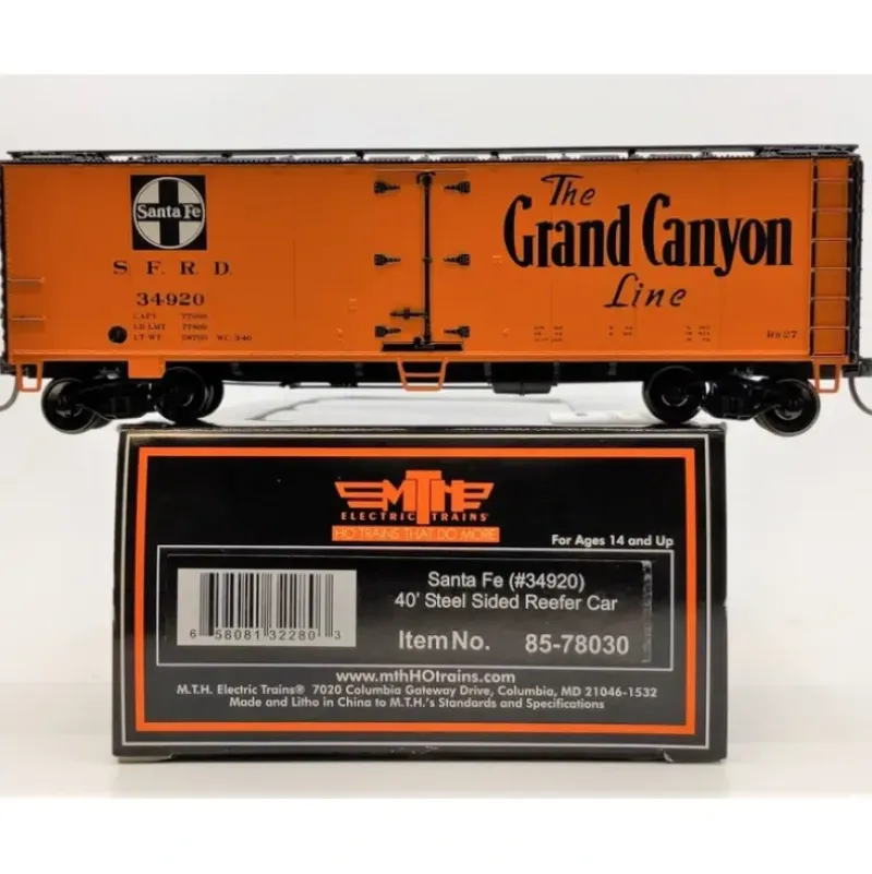This is MTH 85-78030 HO 40 Steel Reefer SF #34920. 40′ steel sided reefer car, Santa Fe. Ready 2 Rail provides the superior quality and detailing you’ve come to expect from M.T.H. coupled with a competitive price point for the entry-level HO hobbyist. These cars offer the same construction and body detailing as their more expensive counterparts, but designed for the budget-minded model railroader. It’s the perfect way to add to a Ready-To-Run set or to introduce someone new to the hobby.