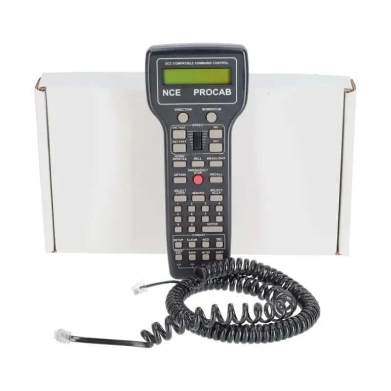Here is an NCE 524-010 ProCab Deluxe Master Cab Handheld Remote with LCD Screen. Our Deluxe ProCab provides the most user-friendly access to all system features. Uncomplicated menus on the easy to read, backlit LCD display guide you through the most advanced operations with a minimum of fuss. Instant control of up to six locomotives via the recall button. This is the wired handheld controller.