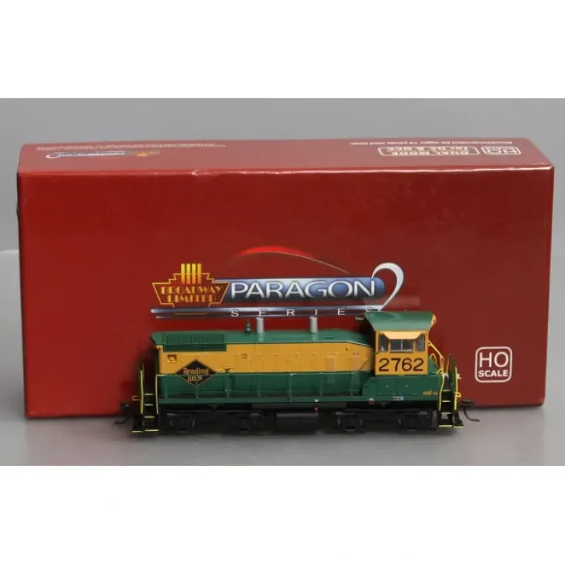 This is a Broadway Limited 3331 HO Scale Reading EMD SW1500 Diesel Locomotive with Sound & DCC – Paragon2 #2762 (yellow, green, black). Industry-Leading Features: The All-New Paragon2 Sound & Control System, Integral DCC Decoder with Back EMF for Industry-Best Slow Speed Operation in DC and DCC, Precision Drive Mechanism engineered for switching,5-Pole Can Motor with Skew Wound Armature, Authentic SW1500 Sounds (on Sound-equipped units only),Premium Caliber Painting with Authentic Paint Schemes, Prototypical Light Operation with Golden White LED Headlight & rear light, Operating Metal Knuckle Couplers, Many separately applied details such as brass bell, grab irons, and ladders, Locomotive length: 6.5 inches, Locomotive weight: approximately 9 oz., Near-Brass Caliber Detail at a Plastic Price, Minimum Radius: 18 or greater recommended. Industry-Leading Features: The All-New Paragon2 Sound & Control System, Integral DCC Decoder with Back EMF for Industry-Best Slow Speed Operation in DC and DCC, Precision Drive Mechanism engineered for switching,5-Pole Can Motor with Skew Wound Armature, Authentic SW1500 Sounds (on Sound-equipped units only),Premium Caliber Painting with Authentic Paint Schemes, Prototypical Light Operation with Golden White LED Headlight & rear light, Operating Metal Knuckle Couplers, Many separately applied details such as brass bell, grab irons, and ladders, Locomotive length: 6.5 inches, Locomotive weight: approximately 9 oz., Near-Brass Caliber Detail at a Plastic Price, Minimum Radius: 18 or greater recommended.