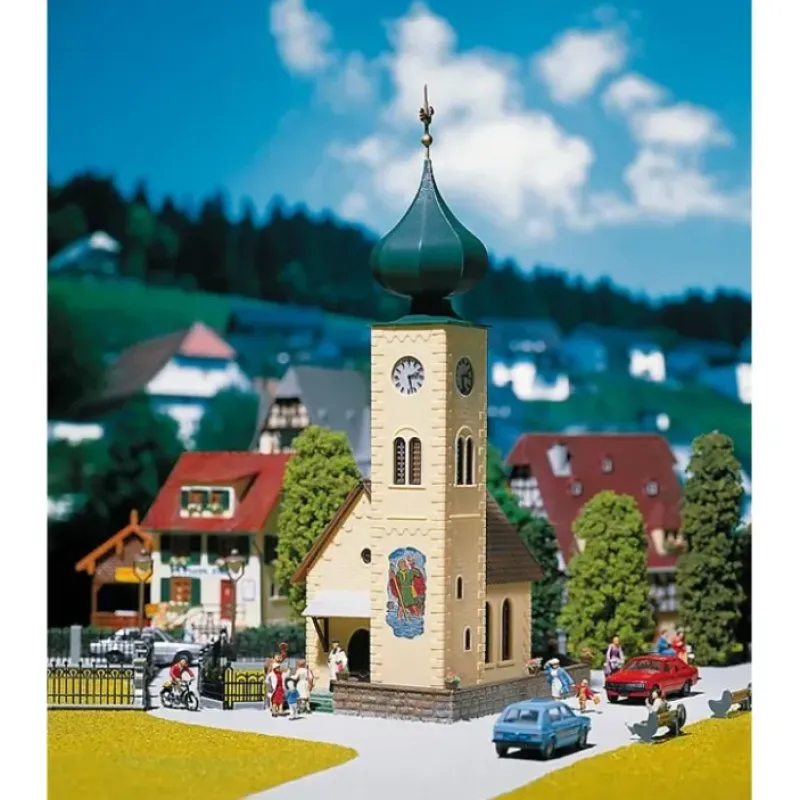This is Faller 130238 Church. The tower has a replaceable roof for respective architectural styles. 3 roofs are included. Reasonably priced and easy-to-build model requiring little space. Particularly suitable for the background. This building kit contains: 60 single parts in 9 colours, window parts, 1 paper mask and 1 construction instruction.
