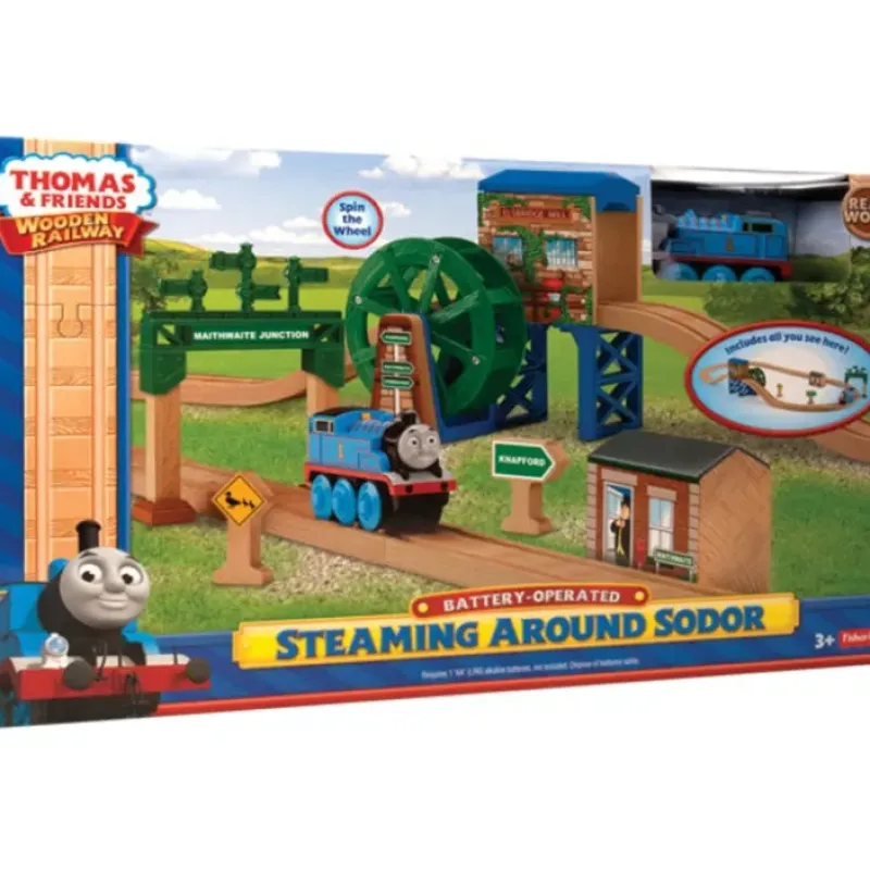 This is a Fisher Price BDG59 Thomas & Friends Wooden Railway Steaming Around Sodor. Thomas is ready to steam around the Island of Sodor in search of adventureand hes battery operated, so little engineers can just turn him on and watch him go! Hell travel around the loop track, chuff along under the signal gantry, then cross the covered bridge at Elsbridge Mill. The water mill really spins, too! Includes: A battery-operated Thomas, Elsbridge Mill, Maithwaite Station, A signal gantry, Track and Two signs.