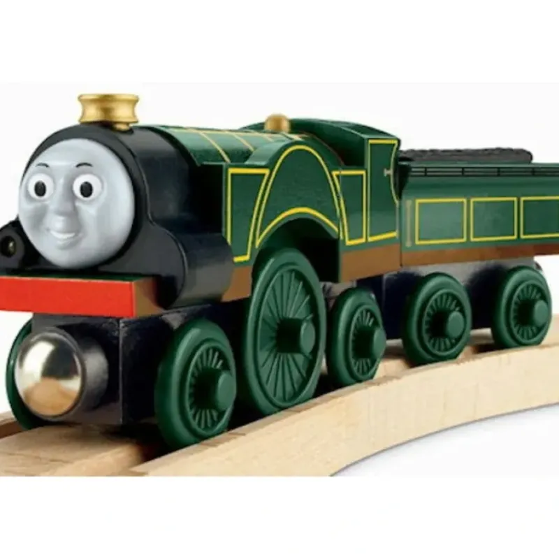 This is a Fisher Price Y4407 Thomas & Friends Wooden Railway Talking Emily. Emily is a beautiful emerald green steam engine with gold trim and matching tender. She’s strong and works hard, but tends to be a bit too bossy for the other engines. If they can gently keep her in her place, all should go well! Press the button to flash her headlight and hear her speak and sound out. Wooden railway engine and tender have magnetic couplers front and rear. About 6 long. For ages 2+.