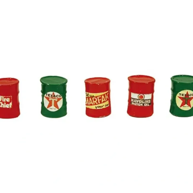 This is JL Innovative Design 562 Texaco Oil Barrels (5) repainted red and green. Add realism to your service station and oil dealer scenes with these layout-ready barrels. Cast-metal barrel come completely decorated in company colors and feature logos where appropriate.