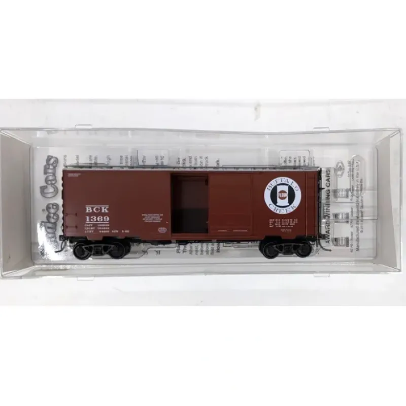 This is a Kadee 4828 HO Scale Pullman-Standard PS-1 40′ Boxcar with 7′ Door – Ready to Run Buffalo Creek #1369 (1952 Scheme, Boxcar Red, silver, Large Logo).