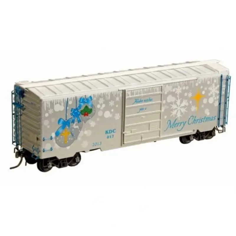 This is a Kadee 6917 HO Scale Kadee 6917 HO Scale KDC 2013 Christmas PS-1 (Pullman-Standard 1) 40′ Boxcar #017 with 8′ Doors. One of the most popular box cars on America’s rails, thousands were built in the 1950s as railroads began replacing worn-out older equipment. The rugged all-steel construction insured a long service life well into the 1980s. These superbly detailed HO Scale models come fully assembled, ready for service. Each includes a one-piece, injection molded body mounted on a metal floor. Separate details are already installed and include: see-through roofwalk, sliding doors (correct style for the prototype car), latches, grab irons, ladders and brake gear. Each rides on Kadee(R) trucks with patented self-centering action for ease of placement on the tracks. Scale draft gear boxes include delayed centering action Magne-Matic(R) metal couplers. Models feature a riveted roof.