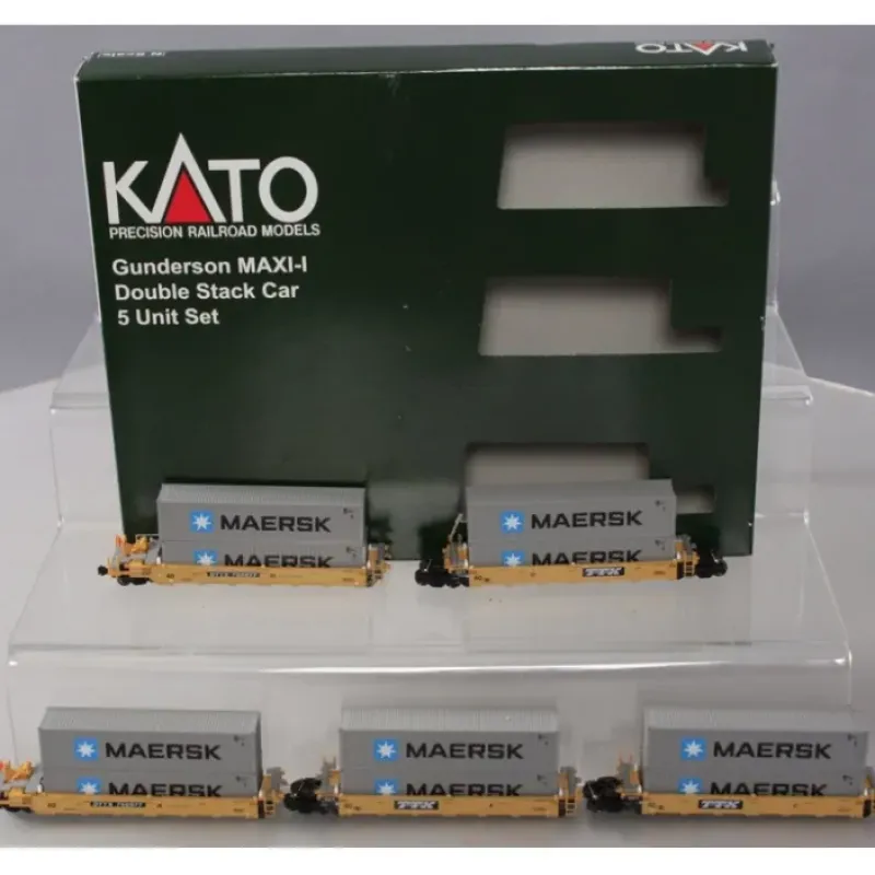 This is Kato 106-6143 N Gunderson MAXI-I Double Stack Car TTX #750977. Like its cousin, the Gunderson MAXI-IV, the MAXI-I is a multi-unit well car designed to carry two stacked intermodal shipping containers. While its base well is 40′, it can accept larger containers such as 45′, 48′ and even 53′ in the top position, making the car a versatile addition to a railroad’s intermodal services. The MAXI-I is a five-unit well car, unlike its 53′ cousin, giving each car a greater capacity even though the individual wells are a smaller size.