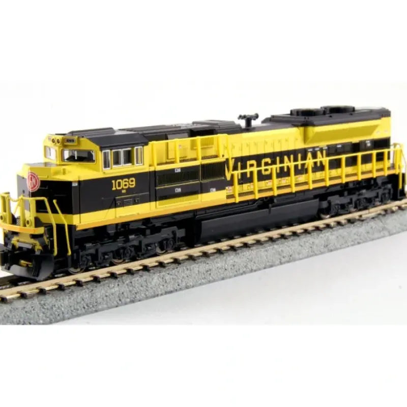 This is Kato 176-8505 N SD70ACe NS Heritage VGN #1069. Virginian. The SD70ACe is the latest in the line of EMD’s ”70” locomotives, an evolution of the SD70MAC, although its radiator design harkens more to that of the SD80/90 body. The SD70ACe has been designed to fit the latest EPA standards and regulations, and sports 4300 horsepower.