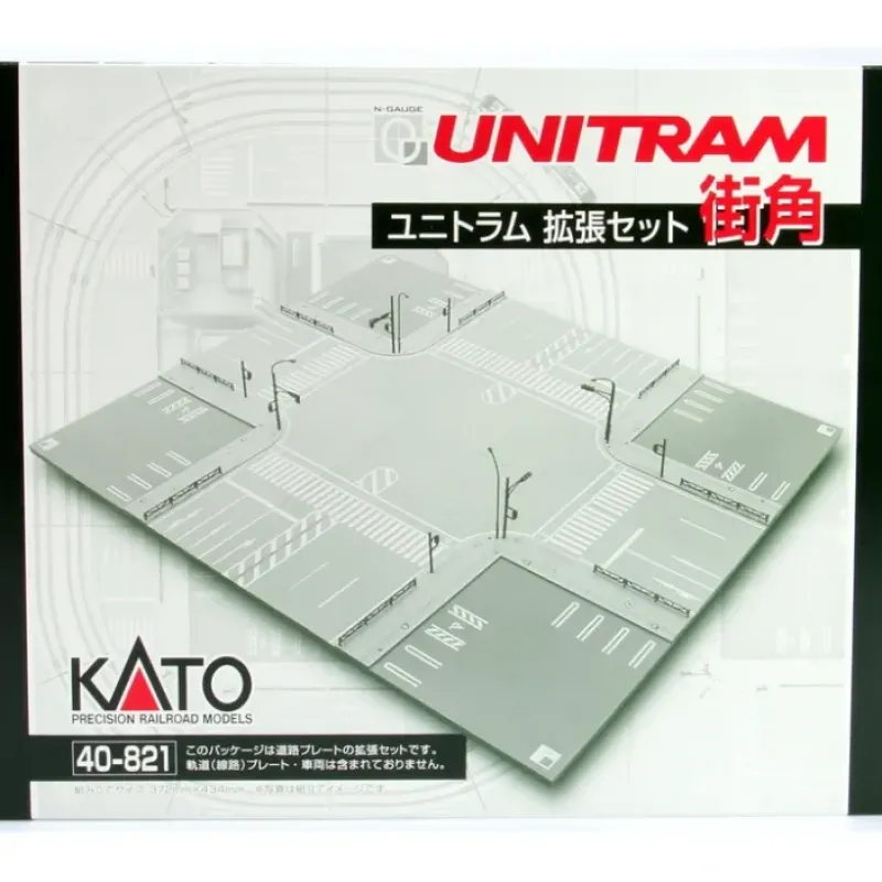 This is Kato 40821 N Unitram Street Track System 4-Way Street Intersection Set (No Track Pieces). Features: UNITRAM Road Plates – 2 x Center Plate with intersection, 4 x Corner Plate with intersection, UNITRAM Accessory kit – includes fences, street lights, traffic signals, and plate joiners.