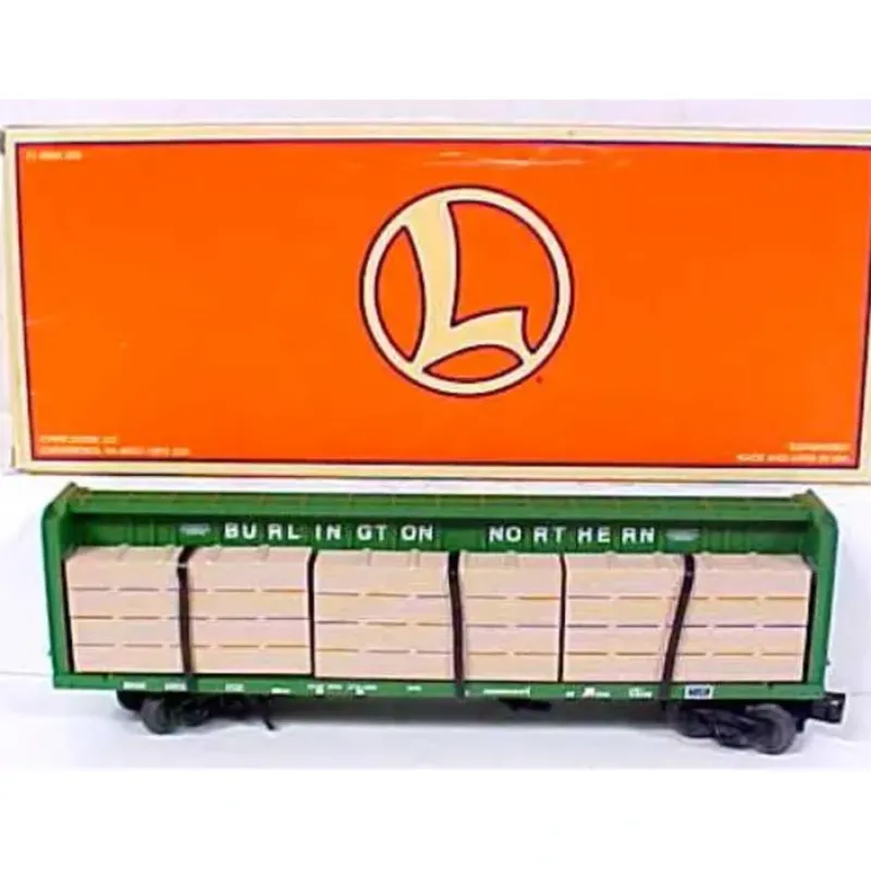 Here is a Lionel 17550 Burlington Northern Center Beam Flatcar with Lumber Load. It features a metal brake wheel, die-cast sprung trucks, magnetic couplers, metal wheels and axles.
