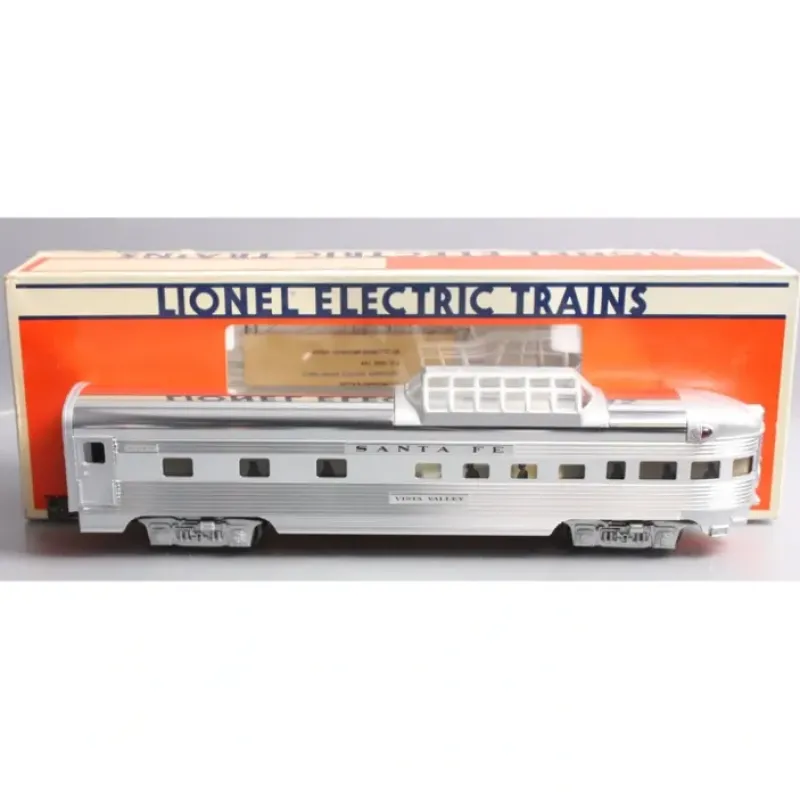 Here is a Lionel 6-19113 O Gauge Santa Fe “Vista Valley” Aluminum Vista Observation Car from 1991. It features die-cast trucks, aluminum construction, operating couplers, a polished roof, an illuminated interior with passenger silhouetted windows, and metal wheels and axles. It measures approximately 16 inches in length.