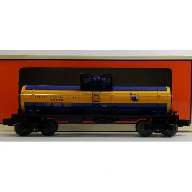 Here is a Lionel 6-25928 O Gauge Central Of New Jersey Single Dome Tank Car #25928. This car features Operating couplers, Die-cast metal sprung trucks, Metal handrails, platform, and ladders on tankcar, Car is individually boxed, Gauge: Traditional O Gauge, Length: 10 1/2 coupler to coupler, RailLine: Jersey Central Lines, and Minimum Curve: O-27.