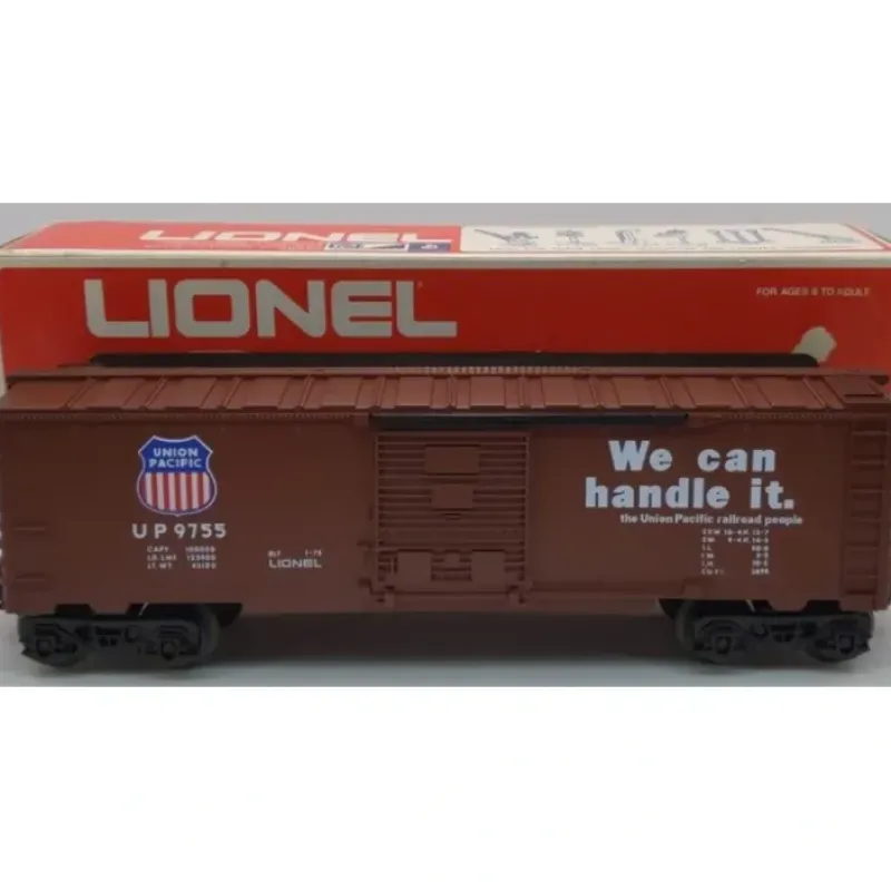 This is a Lionel 6-9755 O Gauge Union Pacific Boxcar from 1975-76. This boxcar features a plastic construction with sliding doors, plastic trucks, metal wheels and axles, and operating knuckle couplers.