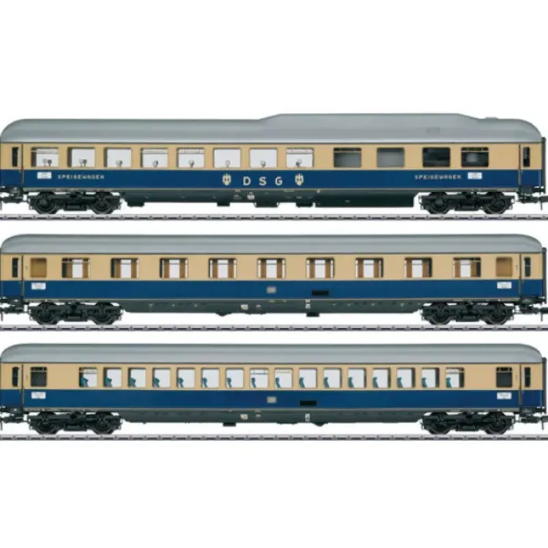 This is a Marklin, Inc 441-58059 I Scale 1962 Rheingold 3-Car Passenger Set w/Interior Lights & Detail – Ready to Run German Federal RR DB TEE, WR4um-62, Av4um-62 & Ap4um-62 (Era IV, blue, cream