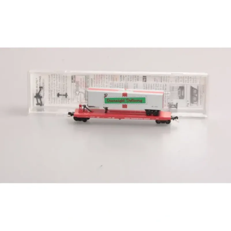 Here is a MicroTrains 64082 Holiday Transportation Co. Flat Car & Trailor. Features: plastic construction, plastic wheels, and knuckle couplers.